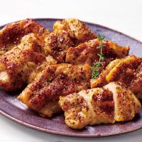 やわらかな鶏もも肉に、さまざまなハーブをまぶし、風味豊かに彩りよく焼き上げました。
