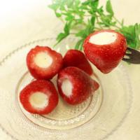 苺の中心をくりぬいて、その中にアイスクリームを搾り込みました。アイスクリームは、苺と相性のよい練乳味を強くし、さらに生クリームで仕上げたアイスです。いちごのやわらかい酸味とフレッシュ感が、濃厚なミルク味と溶け合って絶妙な味を醸し出します。1粒毎にピロー包装しています。※個包装