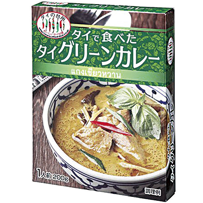 ■原材料:ココナッツミルク、鶏肉、グリーンカレーペースト(唐辛子、にんにく、レモングラス、食塩、ガランガル、シャロット)、たけのこ、砂糖、大豆油、魚醤(魚介類)、タピオカデンプン、えびペースト、クミンパウダー、カフィアライムリーフ■調理方法:(レトルトパウチ)の封を切らずに熱湯で5〜7分沸騰させて温めます。又はレンジは必ず深めの耐熱容器に移し、ラップをかけて温めてください。500Wの場合約2分、600Wの場合約1分30秒加熱してください。■最終加工地:タイ■規格:1食200g