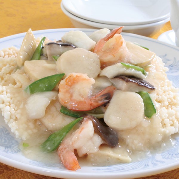 高温の油で揚げるとパリッと香ばしいおこげができあがります。お好みのあんをかけてお召し上がりください。※あんは入っていません。