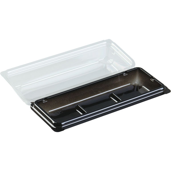 【規格内容】外寸:幅184×奥行74×セット時の高さ20(セット時の蓋の高さ20)/内寸:幅173×奥行58mm【耐冷耐熱温度】80℃【販売形態】折蓋型【形状】外嵌合蓋【材質】OPS【補足2】使い捨て【色】黒透明【柄】柄無【キーワード】おはぎ、饅頭、和菓子容器、和菓子トレー、フタ底別型、テイクアウト容器、上生菓子、おまんじゅう【商品特徴】練り切りやおまんじゅう等に。和菓子3ヶ用