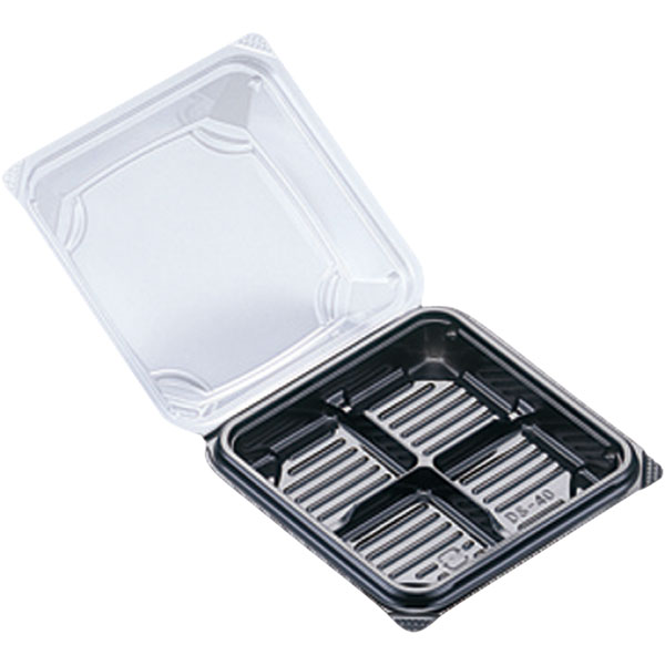 【規格内容】幅132×奥行132×セット時の高さ20(セット時の蓋の高さ20)mm【耐冷耐熱温度】80℃【販売形態】折蓋型【形状】外嵌合蓋【材質】OPS【補足2】使い捨て【色】黒透明【柄】柄無【キーワード】おはぎ、饅頭、和菓子容器、和菓子トレー、フタ底別型、テイクアウト容器、上生菓子、おまんじゅう【商品特徴】練り切りやおまんじゅう等に。和菓子4ヶ用