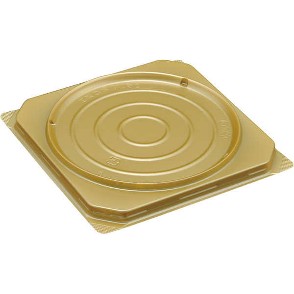 【規格内容】幅148×奥行148×高さ9mm【耐冷耐熱温度】80℃【販売形態】本体のみ【材質】PS【補足2】使い捨て【色】金【柄】柄無【キーワード】スイーツデコ、ケーキドーム、ケーキ容器、ケーキトレー、ケーキ台紙、ケーキプレート、洋菓子店向け【商品特徴】シンプルな形状が高級感を演出するセパレートタイプの菓子容器です。