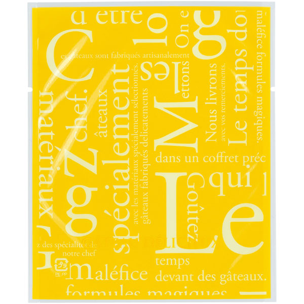 【規格内容】幅115×長さ140mm【厚み】0.06mm【形状】カマス袋【材質】KOP20/LLD40【加工】Uノッチ(左右)付、縦5mmシール【補足1】脱酸素剤対応、乾燥剤対応、ノッチ付【補足2】使い捨て【色】透明黄【柄】柄付【キーワード】菓子袋、ガスバリア袋、焼き菓子袋、焼き菓子用袋、ラッピング、パッケージ、個包装用袋、包材【用途】マドレーヌ、クッキー、パウンドケーキ、焼ドーナツ【商品特徴】洋菓子にぴったりな柄を豊富に揃えました。