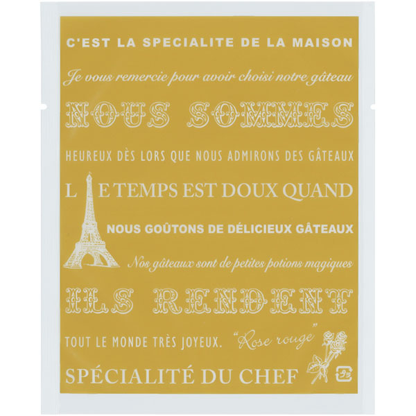 【規格内容】幅130×長さ160mm【厚み】0.06mm【形状】カマス袋【材質】KOP20/LLD40【加工】Uノッチ(左右)付、縦5mmシール【補足1】脱酸素剤対応、乾燥剤対応、ノッチ付【補足2】使い捨て【色】透明茶【柄】柄付【キーワード】菓子袋、ガスバリア袋、焼き菓子袋、焼き菓子用袋、ラッピング、パッケージ、個包装用袋、包材【用途】マドレーヌ、クッキー、パウンドケーキ、焼ドーナツ【商品特徴】洋菓子にぴったりな柄を豊富に揃えました。