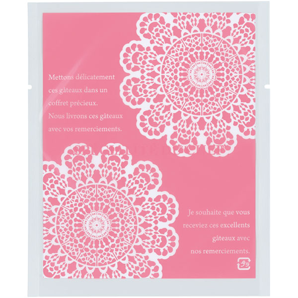 【規格内容】幅115×長さ140mm【厚み】0.06mm【形状】カマス袋【材質】KOP20/LLD40【加工】Uノッチ(左右)付、縦5mmシール【補足1】脱酸素剤対応、乾燥剤対応、ノッチ付【補足2】使い捨て【色】透明桃【柄】柄付【キーワード】菓子袋、ガスバリア袋、焼き菓子袋、焼き菓子用袋、ラッピング、パッケージ、個包装用袋、包材【用途】マドレーヌ、クッキー、パウンドケーキ、焼ドーナツ【商品特徴】洋菓子にぴったりな柄を豊富に揃えました。