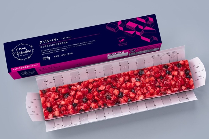 栃木県産いちご「とちおとめ」の果汁を使用、いちごとブルーベリーの果肉を贅沢に敷きつめたフルーツケーキです。果肉の存在感があり、彩り鮮やかなので、ビュッフェボードをより華やかに演出できます。時間が経っても崩れにくく、ビュッフェに最適です。
