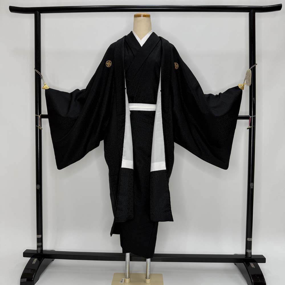男紋付 2点セット 男着物 紋付 ポリエステル 羽織 長着 裄76.5cm 3L size 黒 五つ紋 中古 成人式 5045