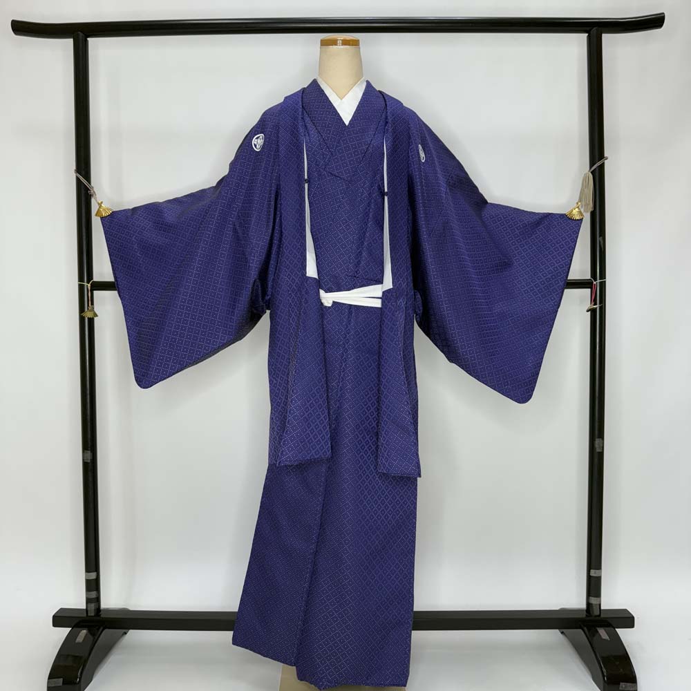 男紋付 2点セット 男着物 紋付 ポリエステル 羽織 長着 裄70.7cm M size 五つ紋 紫 中古 成人式 5055