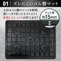 【ズレにくいゴム製土台マット】思いっきりショットを打ってもずれないように土台にはゴム製マットを使用。一般的なEVA製マットやSBR製マットだとショットした瞬間動いてしまい、いちいち元に戻す作業が発生しますが、ゴム製マットは重さがあるので簡単には動きません!