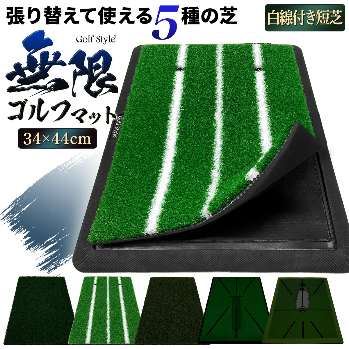 ゴルフマット ゴルフ 練習 マット カスタマイズ可能 張り替え 持ち運び ゴムマット 軌道確認 ドライバー アイアン スイング 34×44cm セット (短芝3本白線+土台)