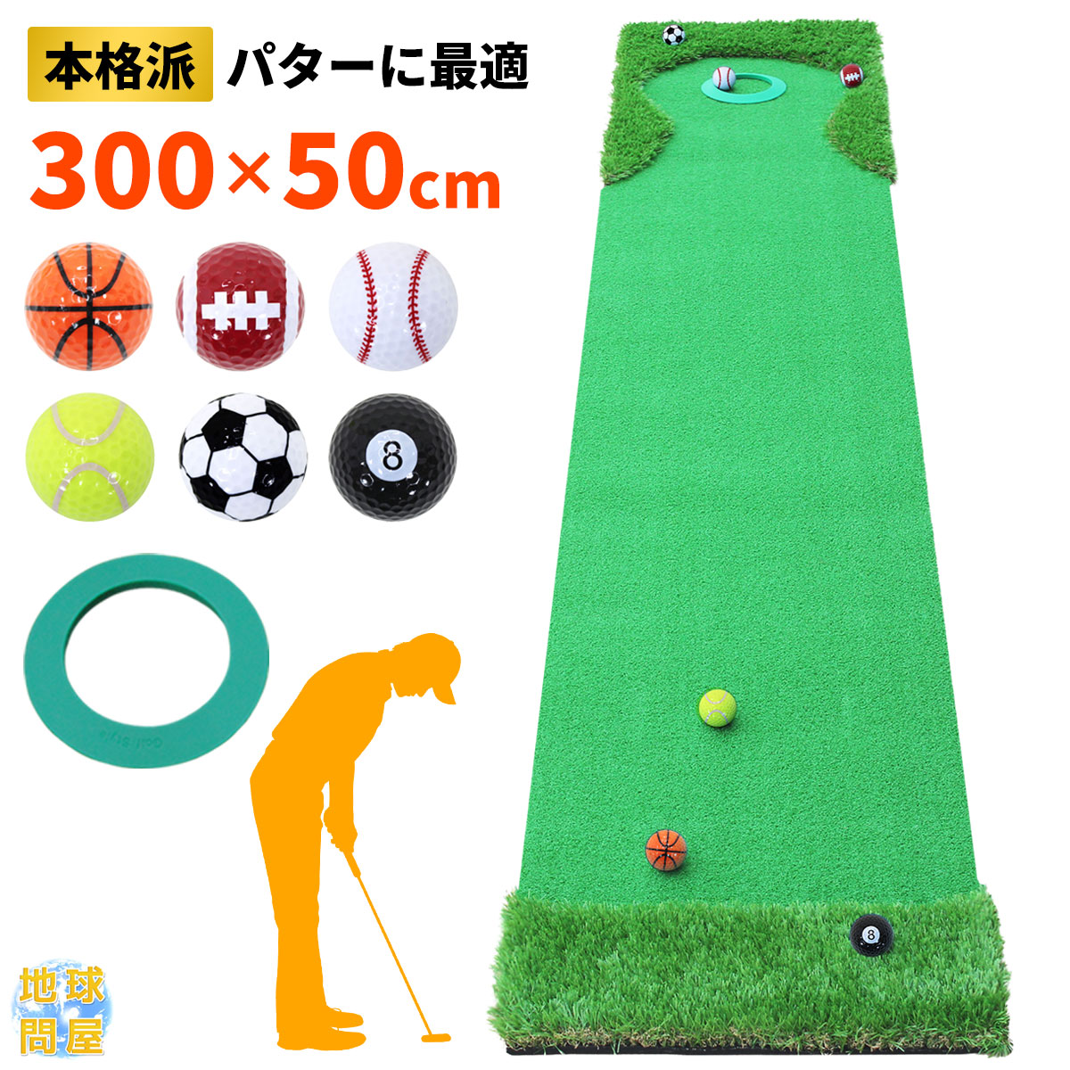パターマット 3m ゴルフ パター ラフ 大型 厚手 室内 屋外 アプローチ 練習用 人工芝 SBR 本格派 300×50cm Ωシリーズ ゴルフボール パターカップ付き GSセット