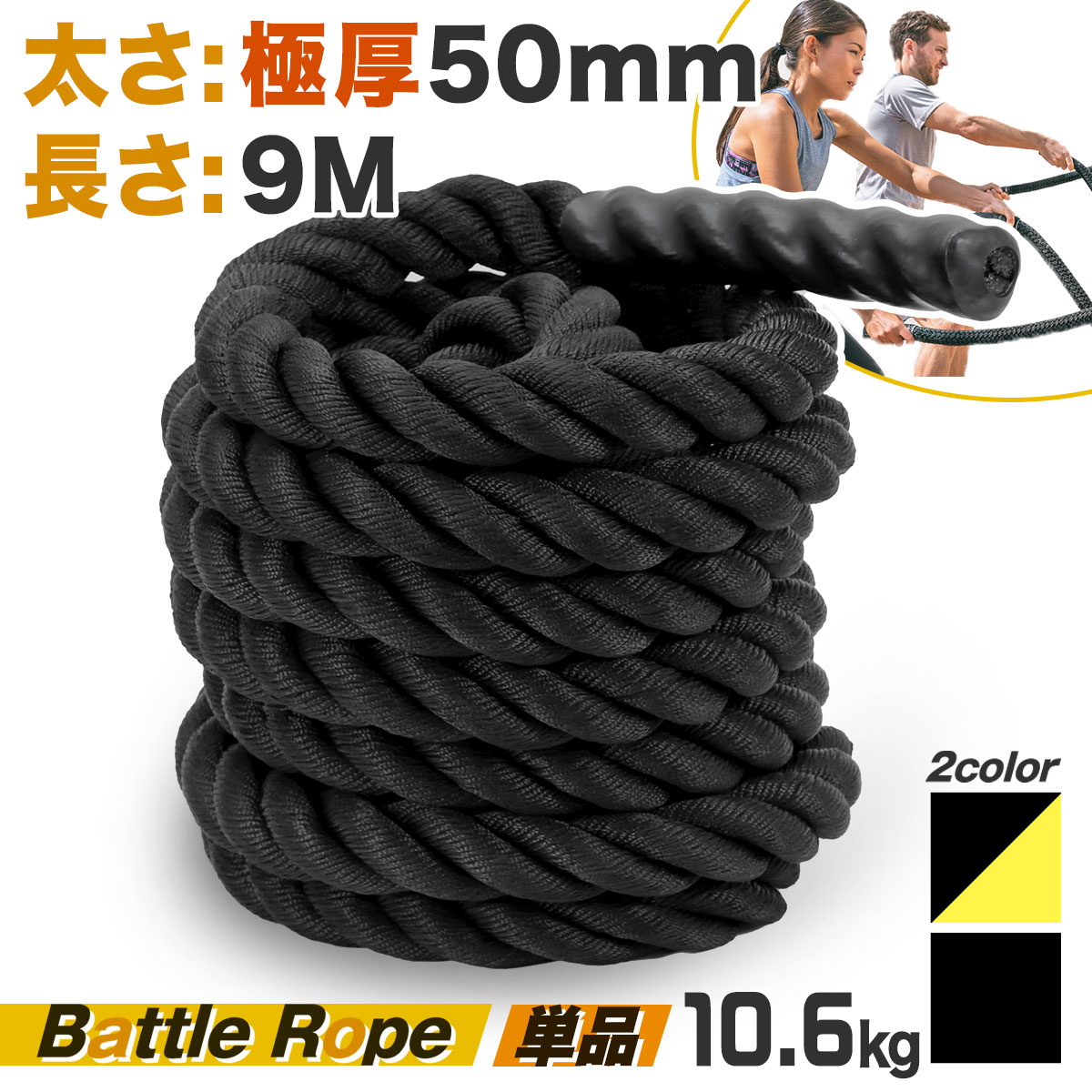 【負荷やトレーニングに合わせて選べる4種類】初心者や女性向けの小径35mmタイプとハードな極厚50mmタイプを始め、好みに合わせて選べるように4種類のロープをご用意しました。カラーも2種類からお選び頂けます。