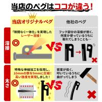 【打ち込みやすく、抜きやすい】ヘッドは円柱形(直径約16mm・厚さ約5.2mm)で、打ち込みやすさに配慮。フックは厚み約3.2mmの仕様です。ペグ穴は大きめ設計で、別のペグを差し込んで簡単に抜くこともできます。