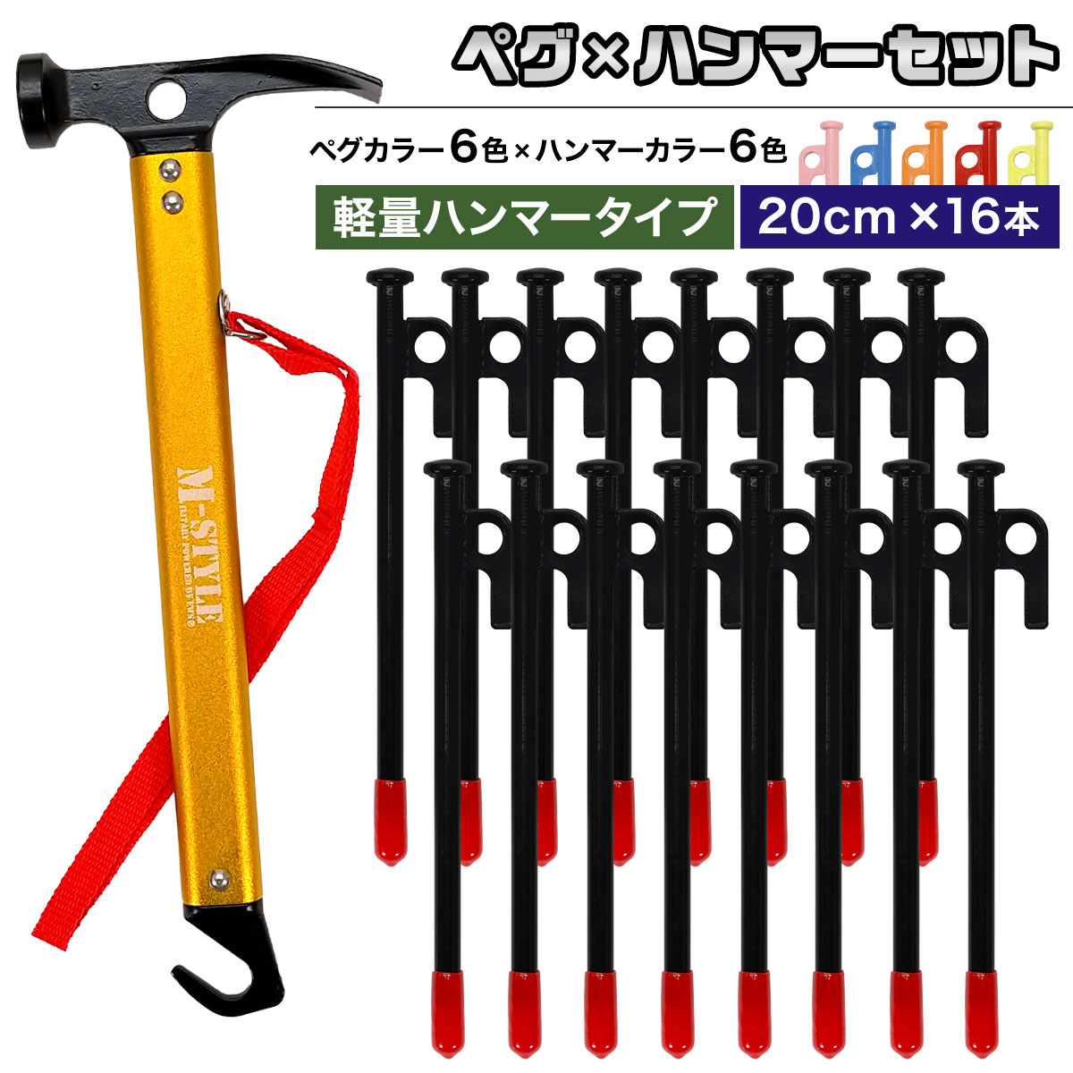 ペグ 20cm 16本 ペグハンマー 軽量 セット 《選べるペグカラーとハンマーカラー》 強靭 キャンプ テント タープ 設営 アウトドア スチール ヘッド ハンマー