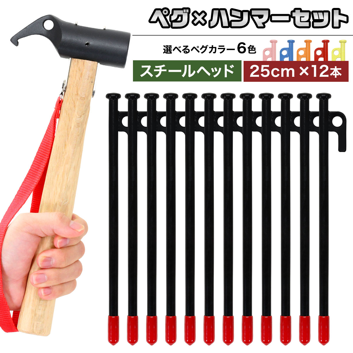 ペグ 25cm 12本 ペグハンマー スチールヘッド セット 《選べるペグカラー6色》 強靭 キャンプ テント タープ 設営 アウトドア スチール ハンマー
