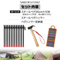ペグ 25cm 12本 ペグハンマー スチールヘッド 袋 セット 《選べるペグカラー6色》 強靭 キャンプ テント タープ 設営 アウトドア ハンマー ペグハンマー収納袋