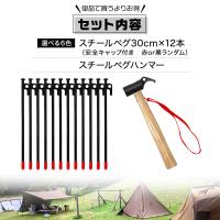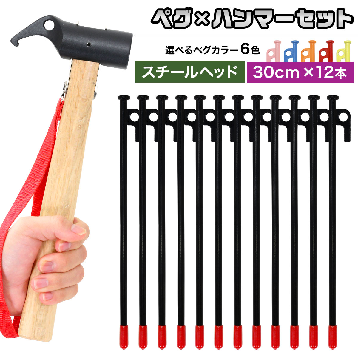 ペグ 30cm 12本 ペグハンマー スチールヘッド セット 《選べるペグカラー6色》 強靭 キャンプ テント タープ 設営 アウトドア スチール ハンマー