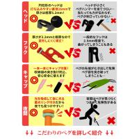 フック部分をレーザー溶接して、隙間なく一体化しました。何度か使っていると取れてしまうという心配もありません。さらに特殊な伸線加工で10mmの鉄を9mmに圧縮して高い強度を実現しました。密度が低くペグが曲がってしまうという心配もございません。また、色付きペグはカラー塗装により視認性が良いため帰宅時のペグの抜き忘れなどの防止にもなります。