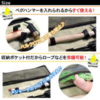 ペグハンマーも取り付けでき、さらにロープやカラビナを収納できるポケットも付いています。
