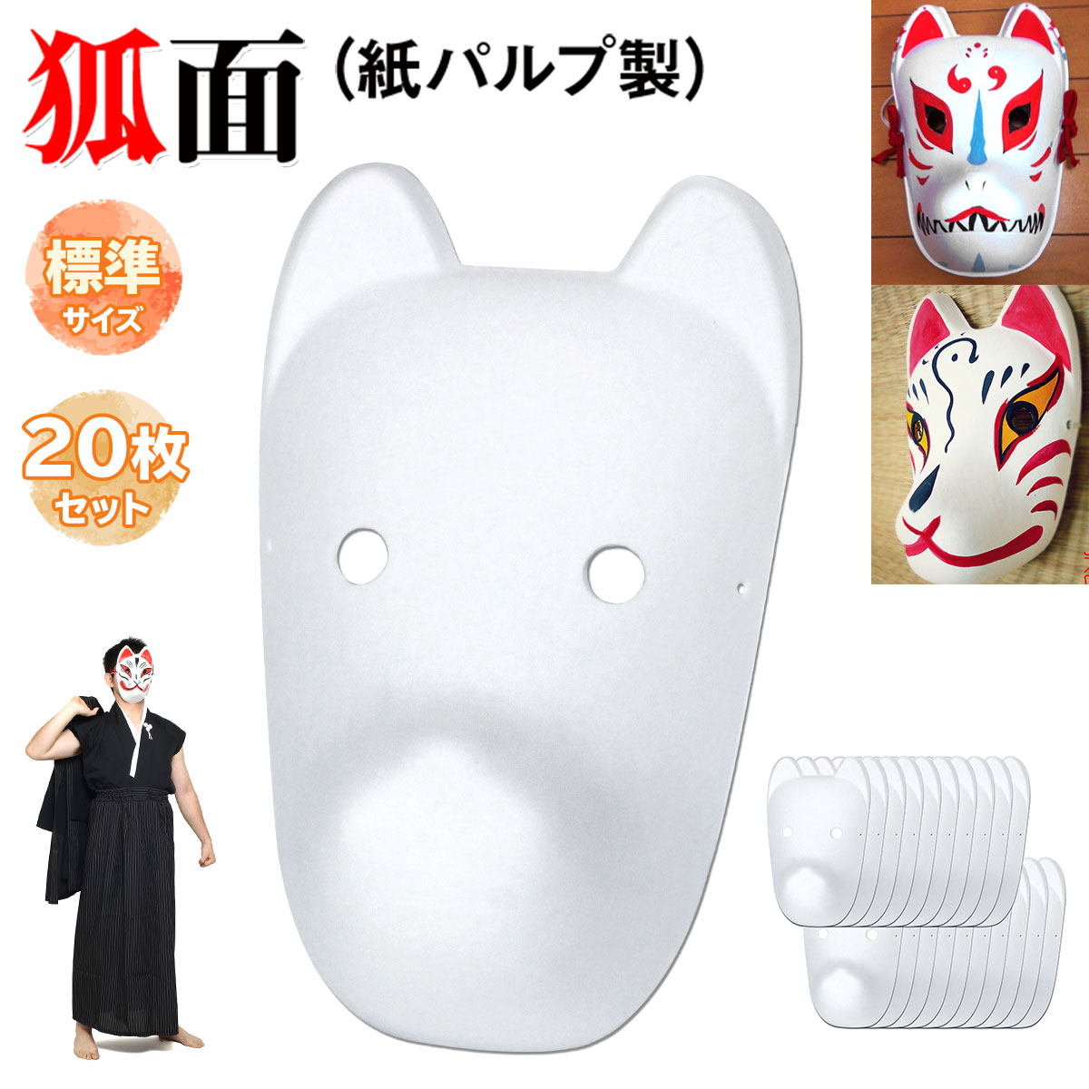 狐面 お面 狐 仮面 マスク コスプレ 無地 白 おめん ペイント 飾り お祭り 紙パルプ製 標準サイズ 20枚セット
