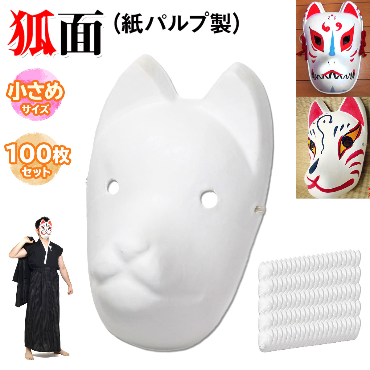 狐面 お面 狐 仮面 マスク コスプレ 無地 白 おめん ペイント 飾り お祭り 紙パルプ製 小サイズ 100枚セット