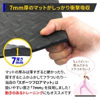 【ちょうどいい7mm厚のマット】マットの厚みは薄すぎると硬かったり、厚すぎるとバランスがとれなかったりしますが、程よい厚みの7mmを採用。しっかり衝撃吸収しつつふらつかない絶妙な厚さです。動きのある運動にもGOOD。