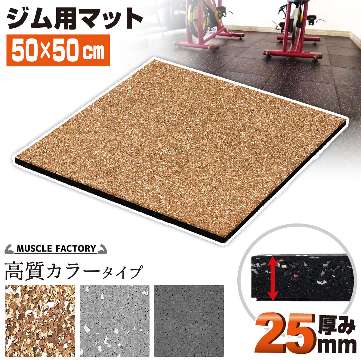 ゴム フロアマット ジムマット 25mm トレーニング マット 防音 防振 衝撃吸収 筋トレ ジム ラバーマット 床 防傷 プロ仕様 50×50cm 高質カラータイプ 単品