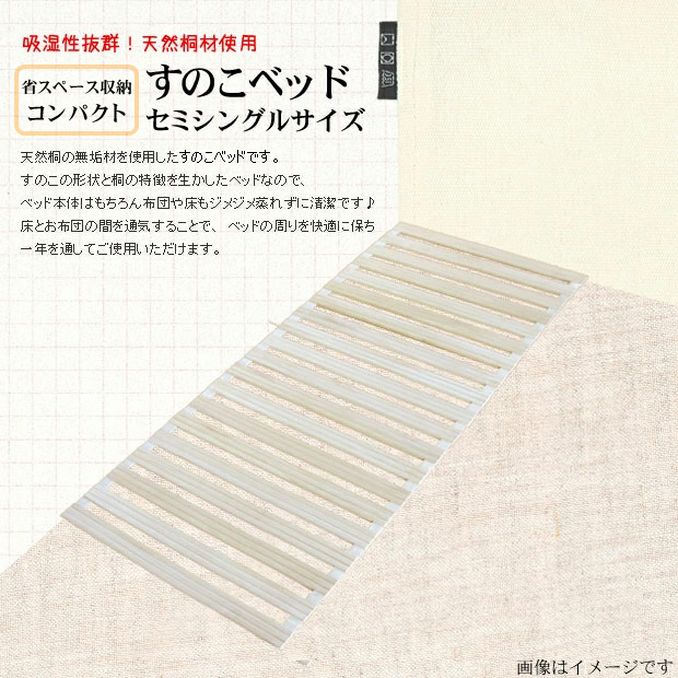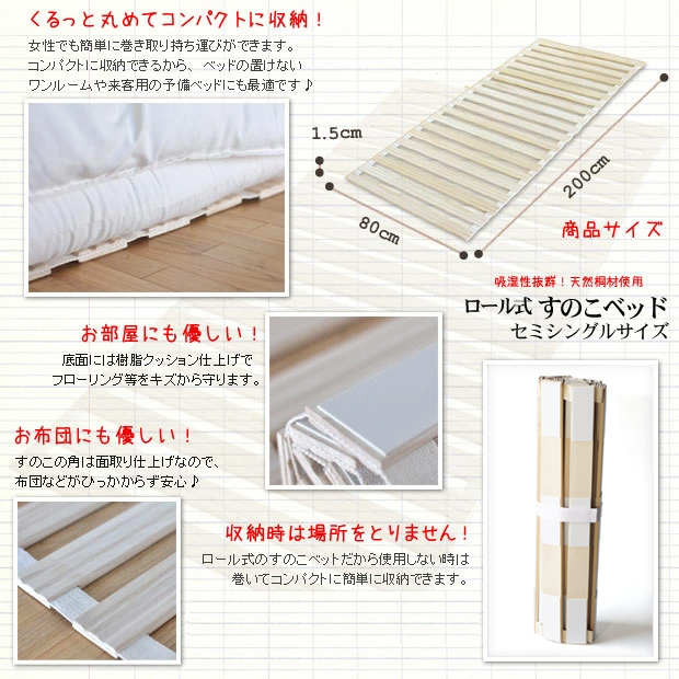 【特 徴】桐製スノコのベッドなので布団やマットレスにこもる熱気や湿気を逃し、いつでも快適。巻いてコンパクトにできるロール式。収納や持ち運びもラクラク。