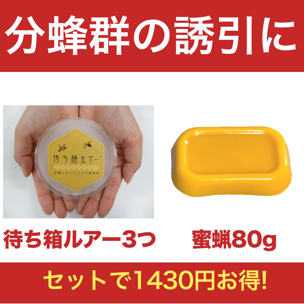 巣箱を自作して、ニホンミツバチを誘引する人におすすめです。待ち箱ルアー3つと、蜜蝋80gがお得なセットになりました。個別に買うよりも約1400円お得です。