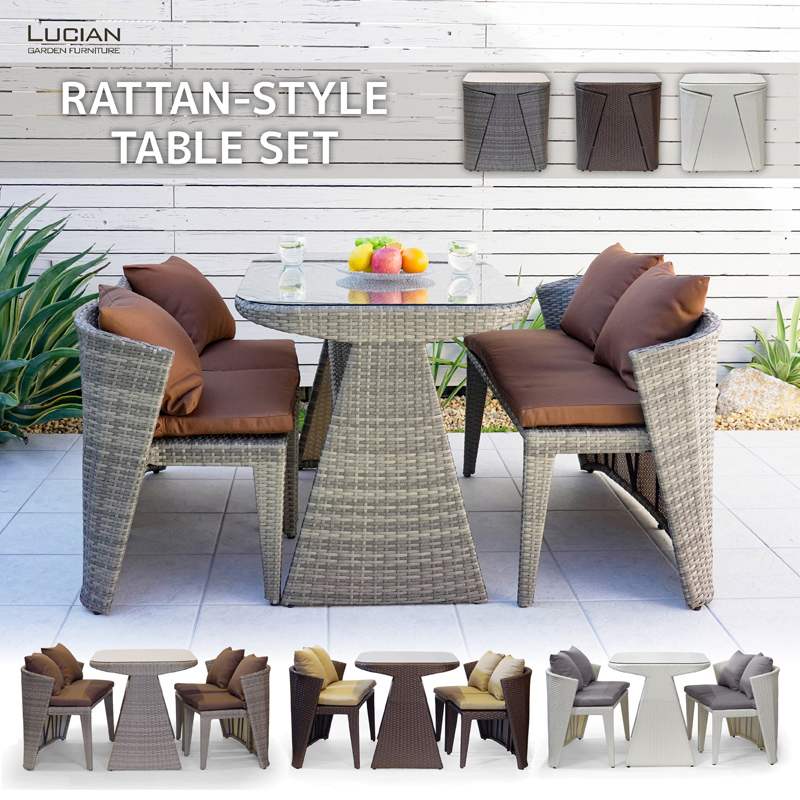 | 商品説明 | お庭やテラスがカフェになるラタン調テーブル&チェアの4人掛けセット。 クッション性と耐久性を兼ね備えた人工ラタンを使用しているから雨や紫外線に強く、屋外での使用にもおすすめです。 また、組み立ての必要がなく、お届けしてすぐに使用できてとっても便利。 ※こちらの商品は屋外対応ですが、クッション・チェアパッドには防水加工は施されておりません。使用時以外は屋根のある場所や屋内での保管をお勧めします。 |