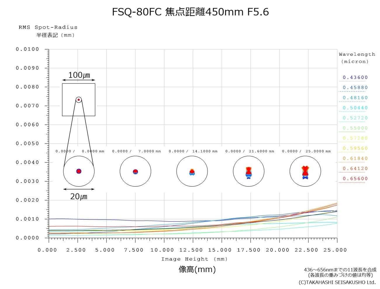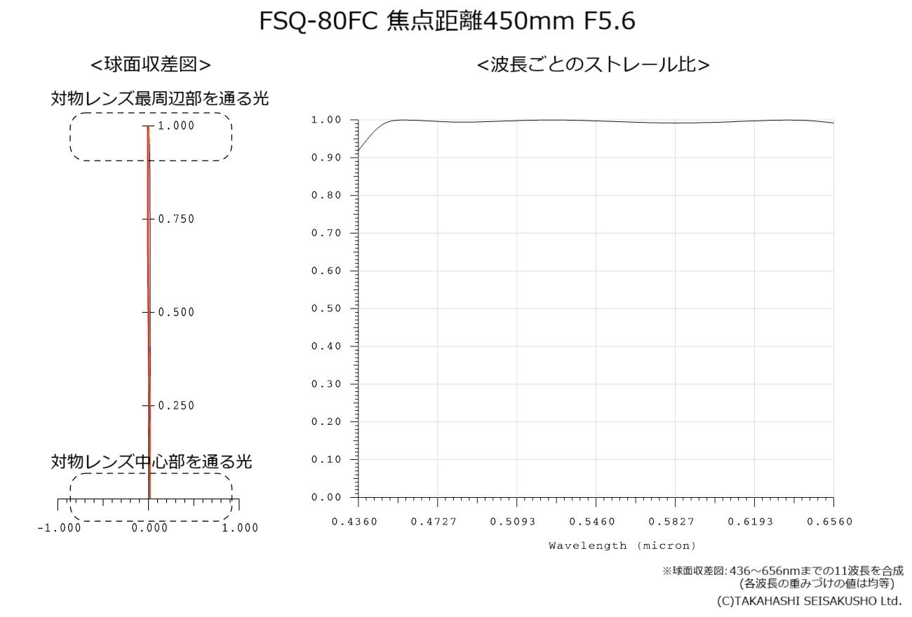 FSQ-80FC は単なるアストログラフではなく、最高峰の眼視性能も兼ね備えています。屈折望遠鏡としては比較的明るいF5.6 の光学系でありながら、中心像の眼視ストレール比は99.7%に達し、この値においては眼視用のフラッグシップモデルであるTOA シリーズをも上回ります。中心像の結像性能の指標となる球面収差図はTOA シリーズと同様に、軸上へ貼り付くような一本の線状です。