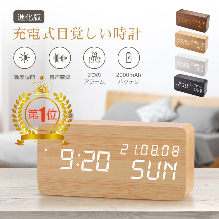 | 【美しくおしゃれな木目調デザイン】 ナチュラルで優しい木目が美しい、シンプルなウッディデザイン。(天然木材ではありません) お手持ちの家具や家電との相性がよくどんな雰囲気にも合わせやすいのはもちろん、お部屋や空間のワンポイントとして、お洒落でスタイリッシュな存在感を放ちます。 【ベッドルームに最適なアラームクロック】 1.振動あるいは70dB以上の音でLED表示を点灯させ、約12秒後にまた消灯し、光が気になって眠れない心配がない! 2.夜時間帯には明るさが自動的に暗くなり、目に優しい程度なので、夜中の時刻確認にピッタリ! 3.iPhonexとほぼ同じなコンパクトサイズで、アラームの設定や解除する時に持ちやすいです。 ※[年]の設定は、年号での設定ではなく西暦の設定になります。2019年の場合は"19"になります。 【大音量目覚まし時計】 アラーム3組は鳴る間隔や回数はお好みで設定可能なので、二度寝防止に最適! 平日、毎日区分してウェイクアップ時間を設定可能!鳴りっぱなしを防止ため、鳴り始めから1分後に自動停止。もちろん任意ボタンを押しても解除できます。 【デジタル温度計】 温度測定範囲:-20℃〜+50℃。表示単位:1℃/1°F。 時刻や日付表示だけでなく、室内の温度管理もこの置き時計で一括管理してくれてとても便利!インフルエンザや風邪などの予防対策、熱中症対策などに参考になって役立ちます。 【省エネなUSB給電式】 普段使い時はパソコンやテレビ等のUSB端子に接続し、又はスマホ充電器やアタプタに挿して直接コンセントから電源をとって下さい。 乾電池での使用は消費が激しいため、おすすめしておりません。2日ほどしか保たない可能性もあります。 同梱品は商品本体、USBケーブル、日本語説明書になります。 アダプターと乾電池は付属しておりませんのでご了承ください。 ※コンセントからの給電はスマホのアダプターなどでご利用頂けます。 【よくあるご質問】 ※設定などがうまくいかない場合には、一度リセットボタンを押し、再度設定をお試しください。 ※製造時期により、リセットボタンが電池入れの箇所にある場合、操作ボタンの下にある場合がございます。 ※当製品は"木目調"時計のため、木目のつなぎ目がございます。ひび割れや破損ではございませんので、ご理解をお願いいたします。 ※ご使用になる前に電池ボックス内部の絶縁シートを剥がしてください。 |