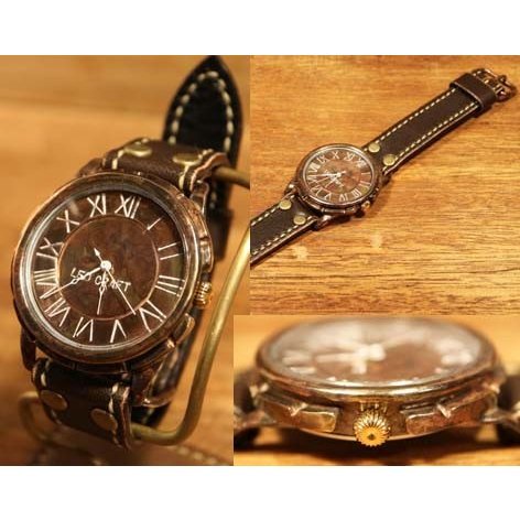 *真鍮やレザーなどの素材を用い、本体ケース、文字盤、ベルト等を彫金、 レザークラフトの技術で制作し、手作業によって組み上げられた時計です。