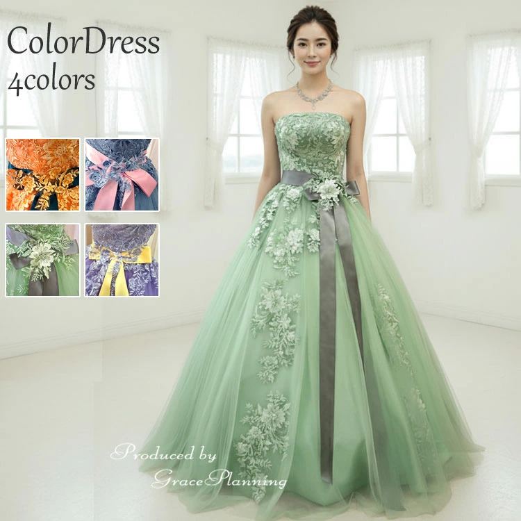 カラードレス 演奏会 発表会 緑 紫 オレンジ 青 結婚式 刺繍が華やかなサッシュリボン付のロングドレス 大きいサイズ cd13036