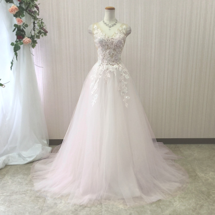 在庫処分 カラードレス ウェディングドレス 9号 Mサイズ 結婚式 花嫁衣裳 披露宴 前撮り ベージュ×ピンク ロングトレーン シースルー wd32169