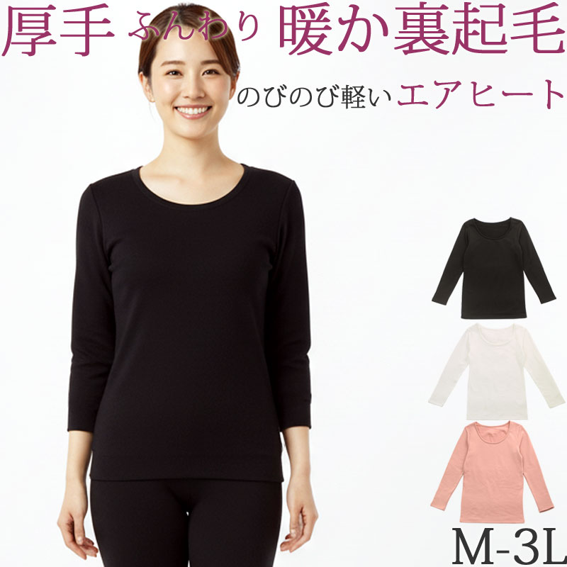 おしり 冷え 防寒 対策に空気をいっぱい含んだ 汗冷えしない軽くてふわふわ 厚手 の 暖かい 裏起毛 インナー 冬 の 防寒 レディースインナー。体にフィットしてくれるのでシャツの下に着てもゴワつく感じがありません。