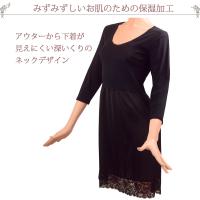 あらかじめ予定の分かっている式典などのフォーマルな日はいいけれども、突然やってくる正装しなくてはならない日のためにタンスに1枚は準備しておきたい黒い下着。突然の不幸に急遽、喪服を着なくてはいけなくなった時に1年を通して重宝します。黒いアウターの襟元や袖口から色物の下着が覗くのは宜しくありません。 どんなドレスやフォーマルにもピッタリのネック。縫製においても丁寧で安心できる国産のインナーです。 |