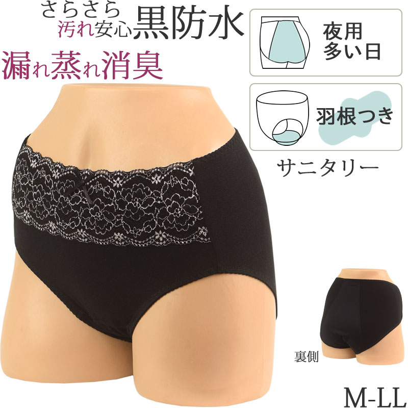 サニタリーショーツ 羽根つき 生理ショーツ はお腹もお尻もすっぽり 深ばき かわいい レース をあしらった 生理用ショーツです。 お尻側に大きい防水シートがあるから夜の漏れも長時間安心、サニタリーショーツ 夜用 ナイト用 生理用パンツ。ナプキンのウイングを内側に折り込める 生理用ショーツ 羽根つき対応 生理用品 です。肌からの湿気を吸湿し外に拡散しても水分は逃がさない、蒸れにくい漏れにくい、サラサラ快適な消臭透湿防水布の黒マチ部分は生理の臭いを軽減し、経血の汚れが目立たず、お洗濯で簡単に汚れが落ちます。ナプキンやパンティライナーのテープのつけ外しが簡単なのにしっかり接着。 肌に優しい綿混ストレッチコットンのベア天竺素材 の 女性下着 です。M.L.LL大きいサイズまであるので、妊婦さんや出産後から産褥ショーツ、産後用 に、ジュニア 用 高校生 中学生 小学生 としても 、更年期には吸水ナプキンと併用して 女性用 尿漏れパンツ、失禁パンツ、防水パンツとして使えます。 |