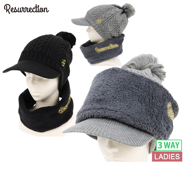 キャップ つば付きニット帽 ニットキャップ フリースネックウォーマー付き 3WAY 保温 防寒 裏フリース ケーブル編み ボンボン付き ロゴ刺繍 ゴルフ