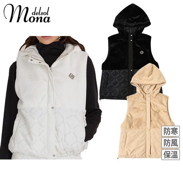 ベスト フード付き ファーベスト 中綿入り 保温 防寒 異素材切替 ロゴモノグラム柄 メタルワッペン ゴルフウェア