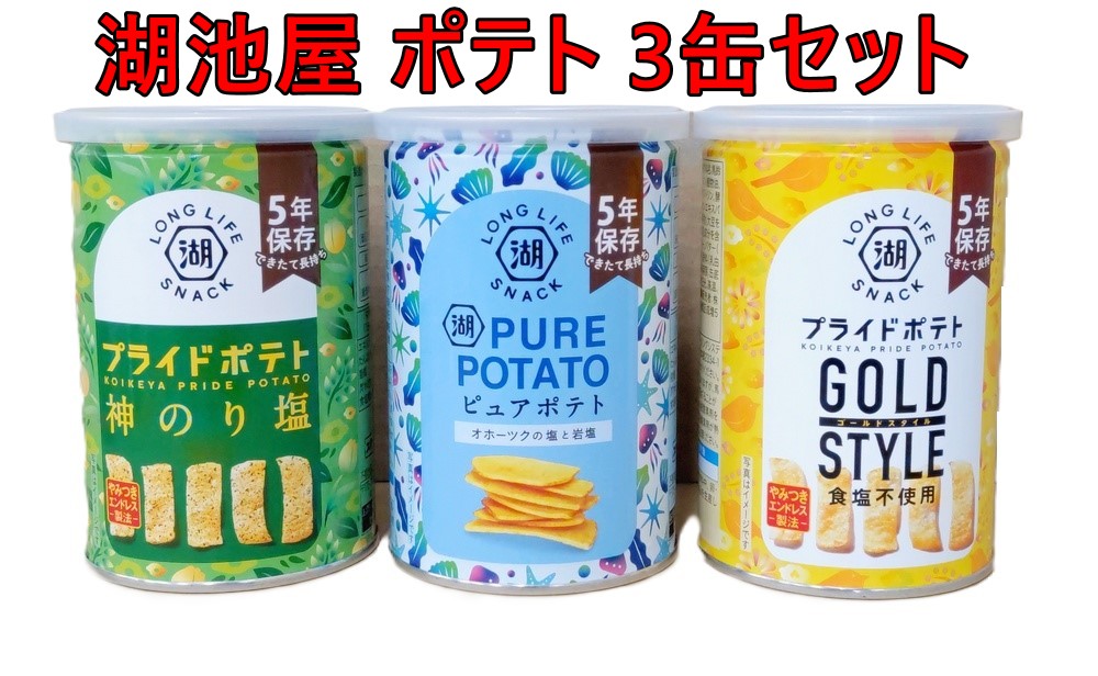 防災食 お菓子 湖池屋 ポテト缶詰 3種類セット 備蓄 保存食 オホーツクの塩と岩塩 ゴールドスタイル 神のり塩 5年保存