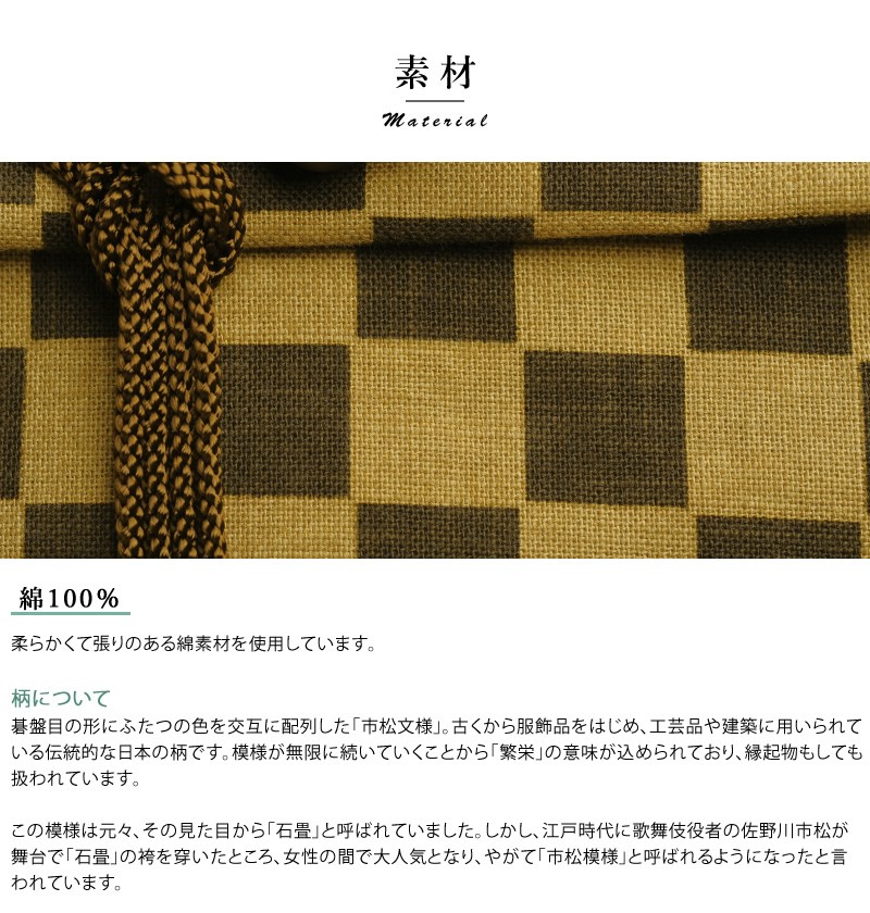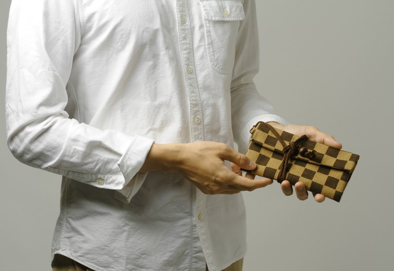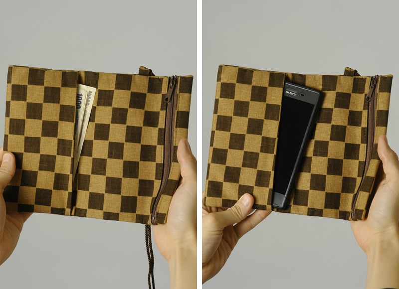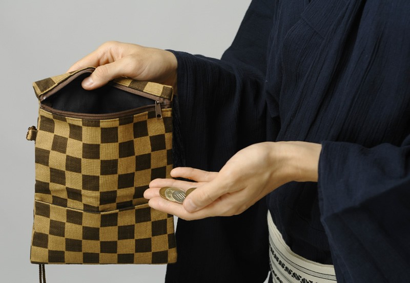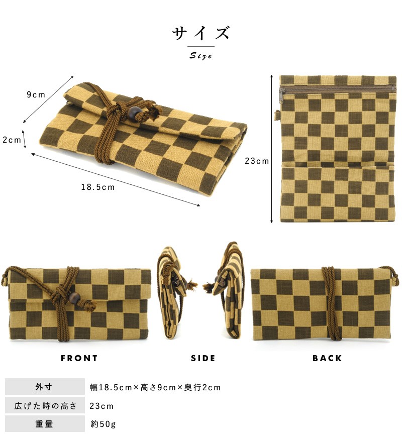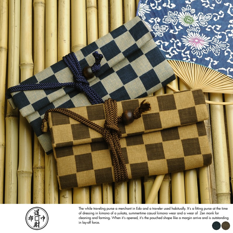 | 江戸の商人や旅人が愛用した道中財布。浴衣や甚平、作務衣などの和装時にぴったりな財布です。広げると巾着のように袋状のかたちになり、収納力は抜群。昔は小判や分銀を入れていましたが、現代ならお金の他にスマートフォンを入れたり、小物用のポーチとして使用することも可能です。 |