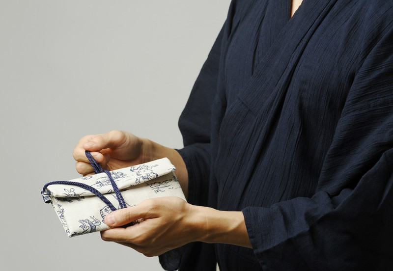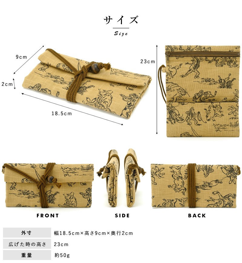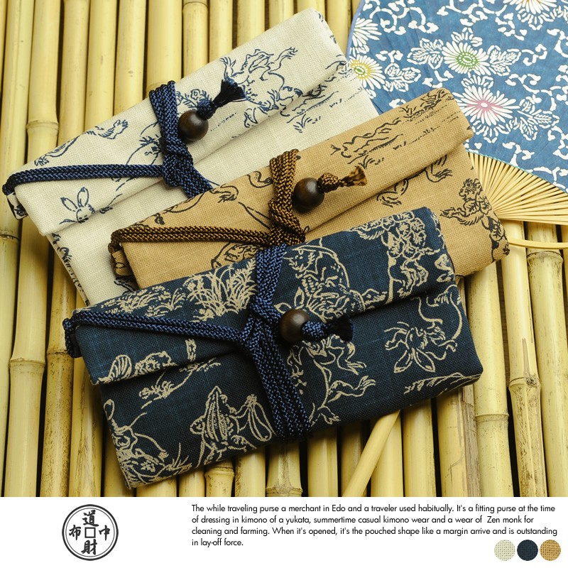 | 江戸の商人や旅人が愛用した道中財布。浴衣や甚平、作務衣などの和装時にぴったりな財布です。広げると巾着のように袋状のかたちになり、収納力は抜群。昔は小判や分銀を入れていましたが、現代ならお金の他にスマートフォンを入れたり、小物用のポーチとして使用することも可能です。 |