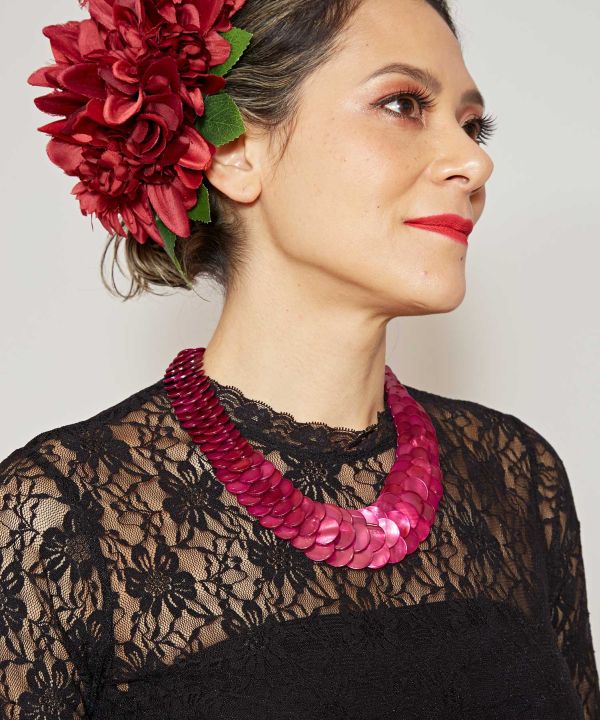 天然素材のシェルをひとつひとつ手作りで重ね合わせた技法は、サンセットにきらめくマーメイド模様のように光り輝き、胸元を豪華に飾ります。