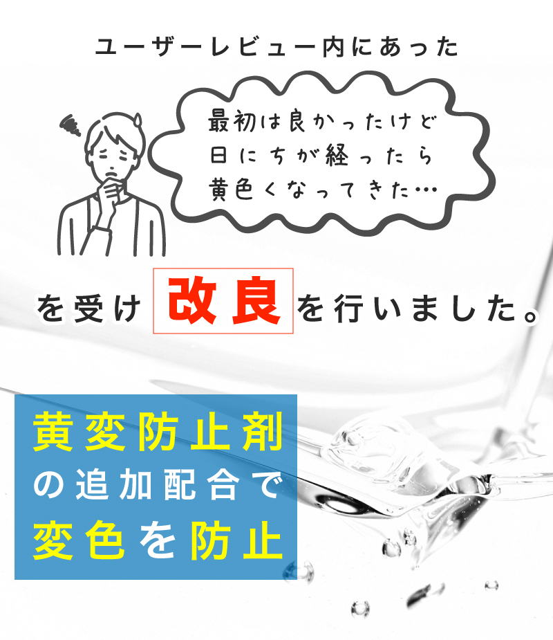 黄変防止剤配合で紫外線による変色を抑え、透明を維持します。