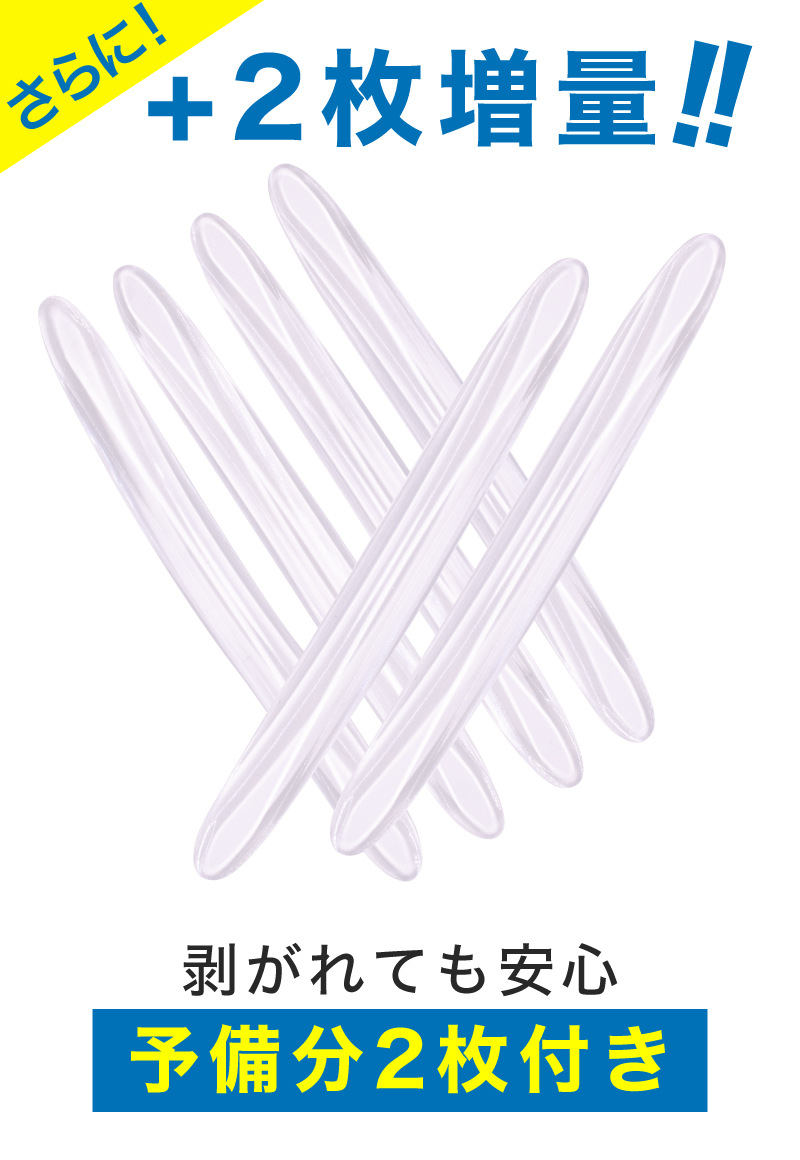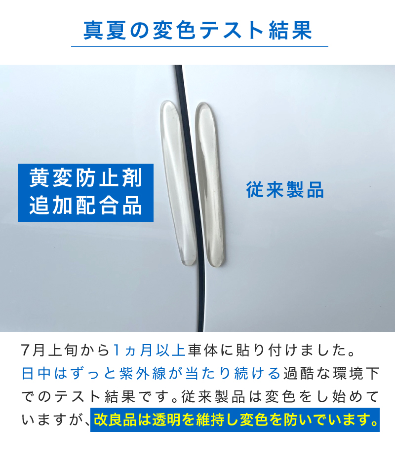 従来品は長期間による強い紫外線の影響により変色がおこりましたが、黄変防止剤を配合した高耐久品へと改良を行いました。さらに剥がれても安心の予備分を2枚プラスした増量タイプです。