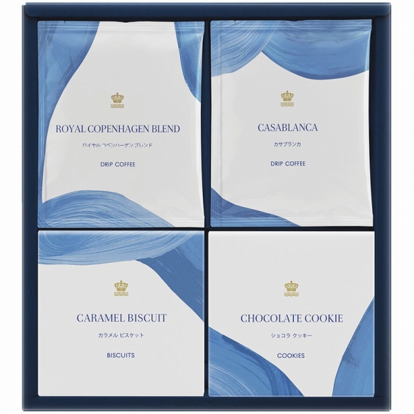北欧ブランド「ロイヤル コペンハーゲン」の味わいをどうぞ1775年にデンマークで開窯した北欧ブランド「ロイヤル コペンハーゲン」。オリジナルブレンドやカサブランカ農園の豆を使用した香り豊かなドリップコーヒーにクッキー2種類をセット。ちょっとしたブレイクタイムにおススメのひと品です。
