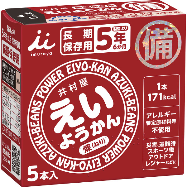 手軽にカロリ-補給可能な長期保存型(賞味期限5年6ヵ月)のようかんです。非常用食品として備蓄、アウトドア-でのエネルギ-補給用に携行可能。アレルゲンフリ-です。内箱に「ようかん□数5本入り」と点字表示、内箱裏面には災害用伝言ダイヤルの利用方法を表示してあります。