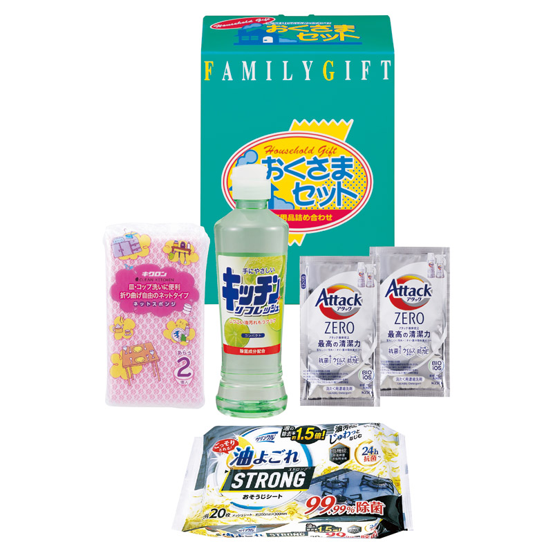 ●商品内容 花王アタックZEROワンパック(10g×2袋)・キッチンリフレッシュコンパクト(270ml)・クリンクル油よごれおそうじシート(20枚)・ネットスポンジ(中国)(2個入)×各1 ●パッケージサイズ 9.5×15×19.5cm